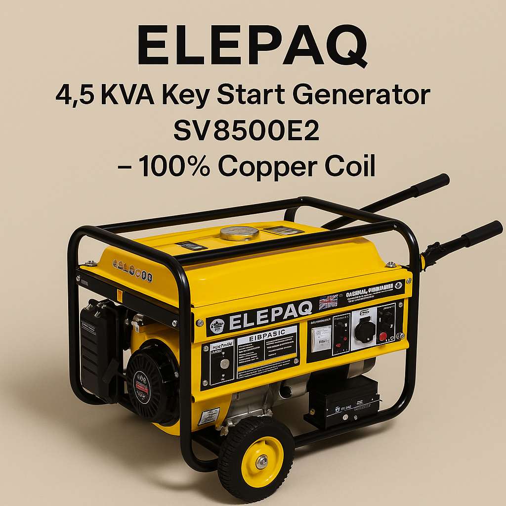 When it comes to reliable and affordable power backup for Nigerian homes, shops, and small offices, the Elepaq 4.5KVA Key Start Generator SV8500E2 stands out as a top performer. Proudly offered by Elomart this robust and efficient generator is the ideal solution for battling Nigeria’s erratic power supply. Designed with convenience and longevity in mind, this generator features a powerful 4.5KVA output capacity, an easy-to-use key start ignition, and a 100% copper coil for optimal conductivity and durability.