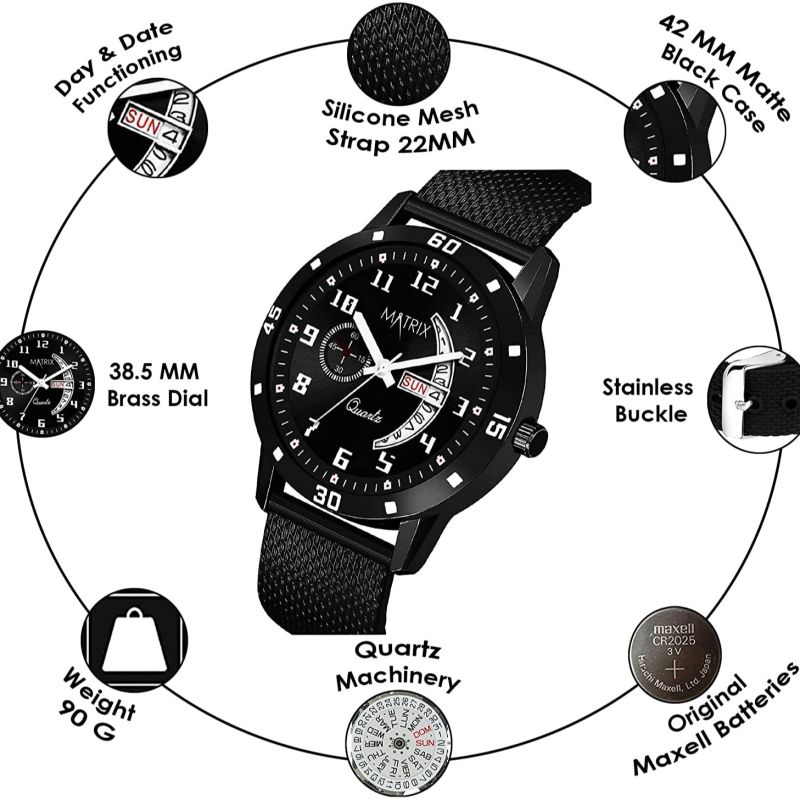 • Dial : Black , Features : Day & Date Functioning, Mesh Design Silicone Strap