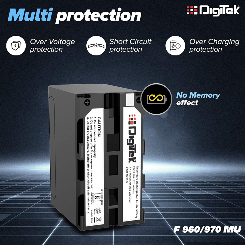 • POWERUP YOUR EVERY SHOT: Digitek li-ion rechargeable camera battery F-970 offers high performance and greater run time. Best in Industry 7.4 Volts 9000 mAh Capacity Lithium Ion rechargeable batteries designed for cameras and camcorders.