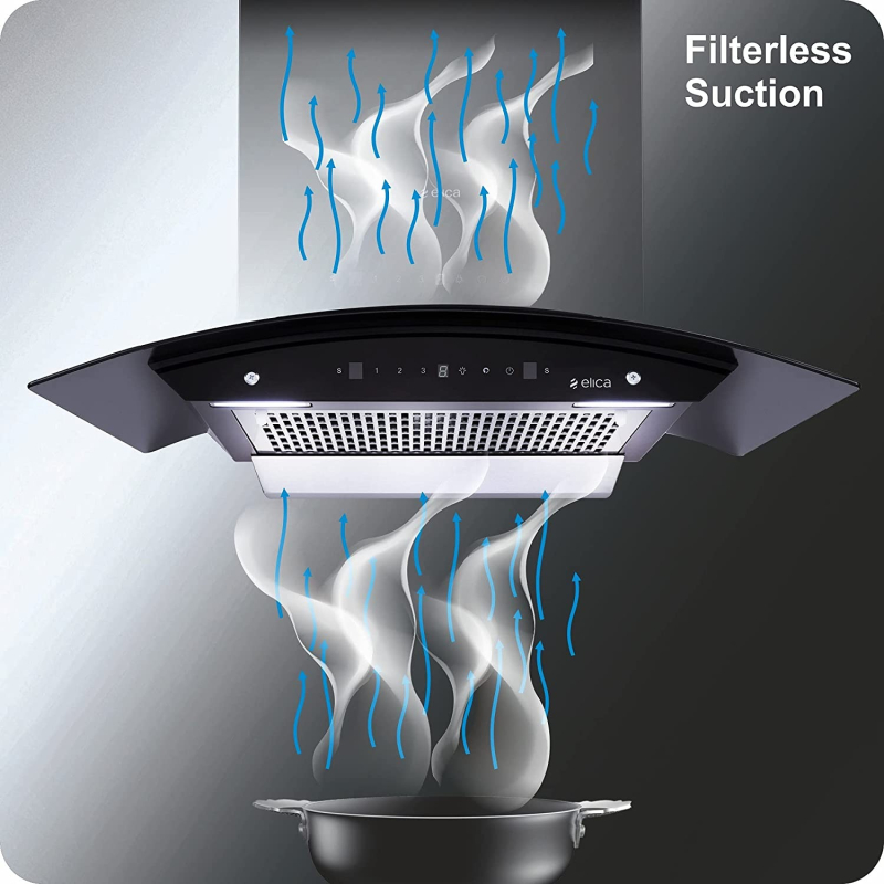 • Filter-less technology ensures powerful suction capacity, it draws in the unhealthy smoke and oily fumes more efficiently and keeps your kitchen smoke free.