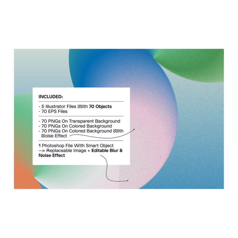 • Set of 70 gradient blend objects, from simple universal logos to quirky and funky design elements